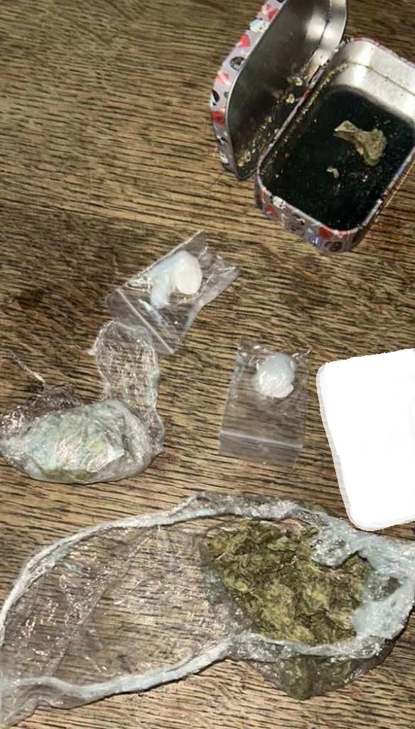 - metalna kutija sa dvije PVC kesice bijele materije i dva PVC pakovanja sa zeljastom materijom koja asocira na opojne droge,