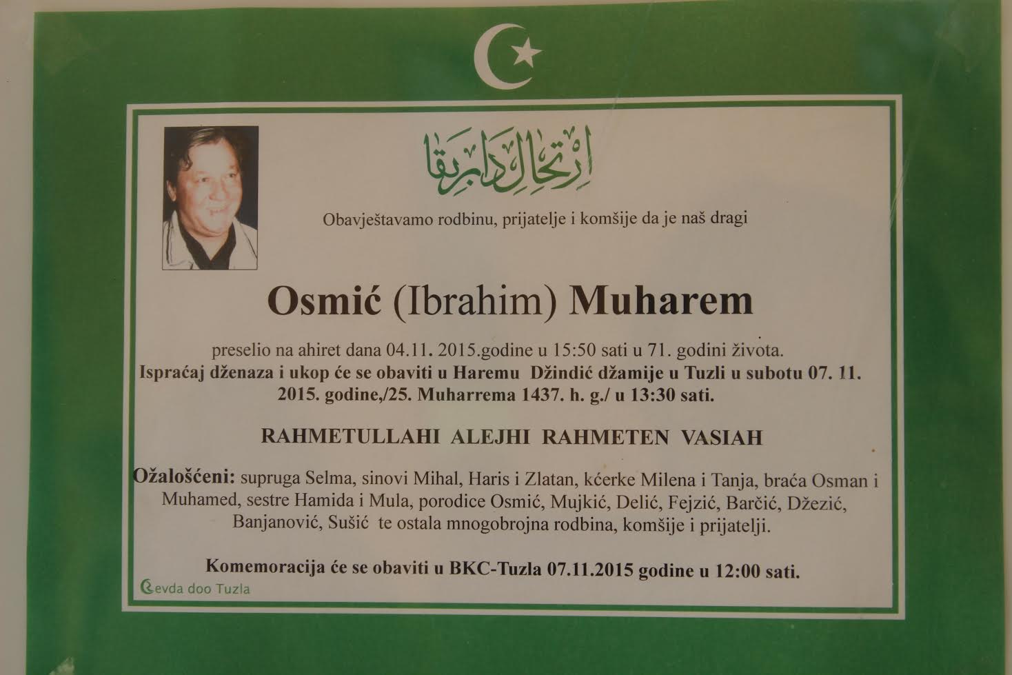 Istoga dana je klanjana dženaza i obavljen ukop u haremu Džindić džamije.