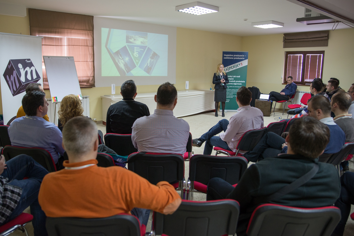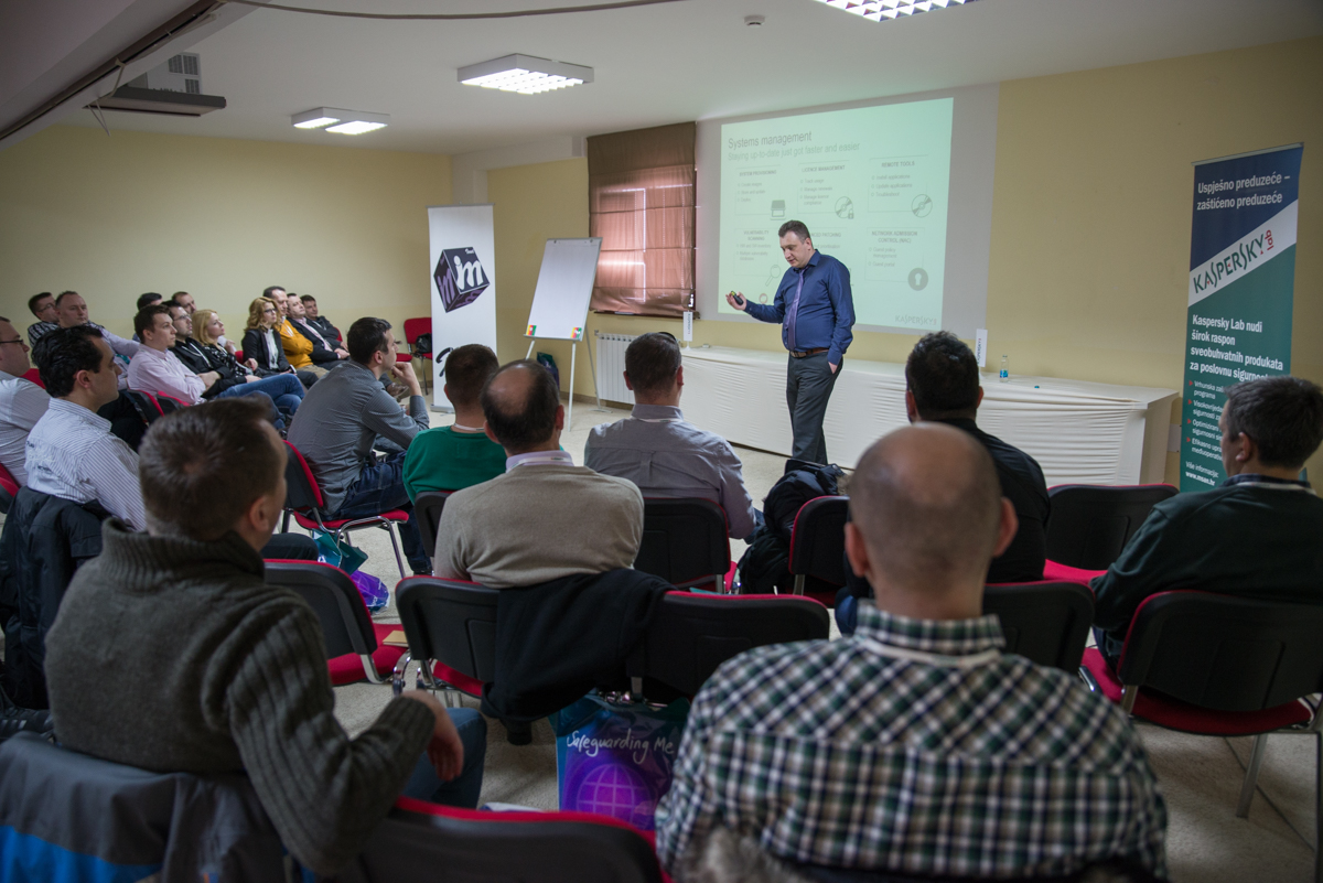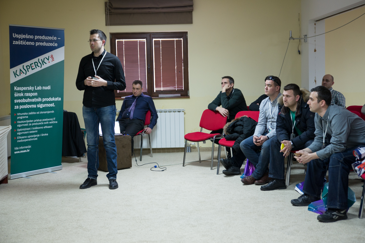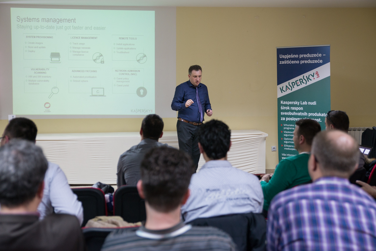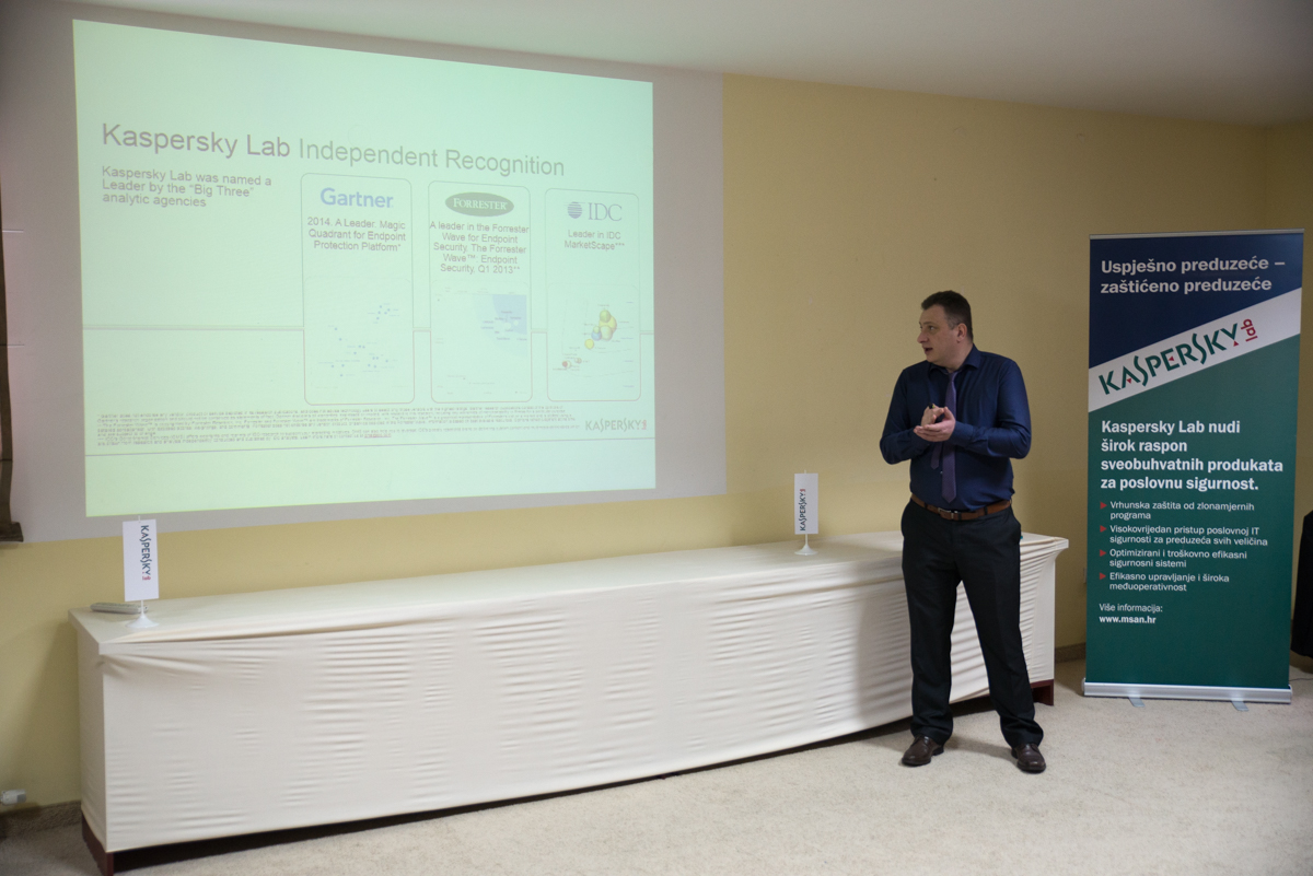 Davor Breka, predstavnik Msan Groupacije iz Zagreba, održao je predavanje uz nešto više tehničkih detalja koji su vezani za trendove u anti-virusnoj industriji sa posebnim osvrtom na Kaspersky Security Center 10 i Kaspersky Endpoint Security 10. Riječ je o najboljim sigurnosnim rješenjima za poslovne korisnike koji kombinuje zaštitu za računare, server za dokumente (File server), Web gateways, mail sistem i zaštitu mobilnih uređaja. U pitanju je najbolja zaštita za mreže u kompanijama.