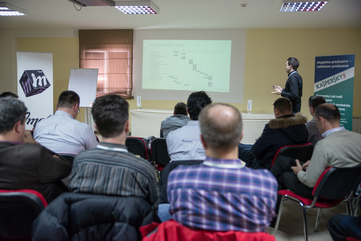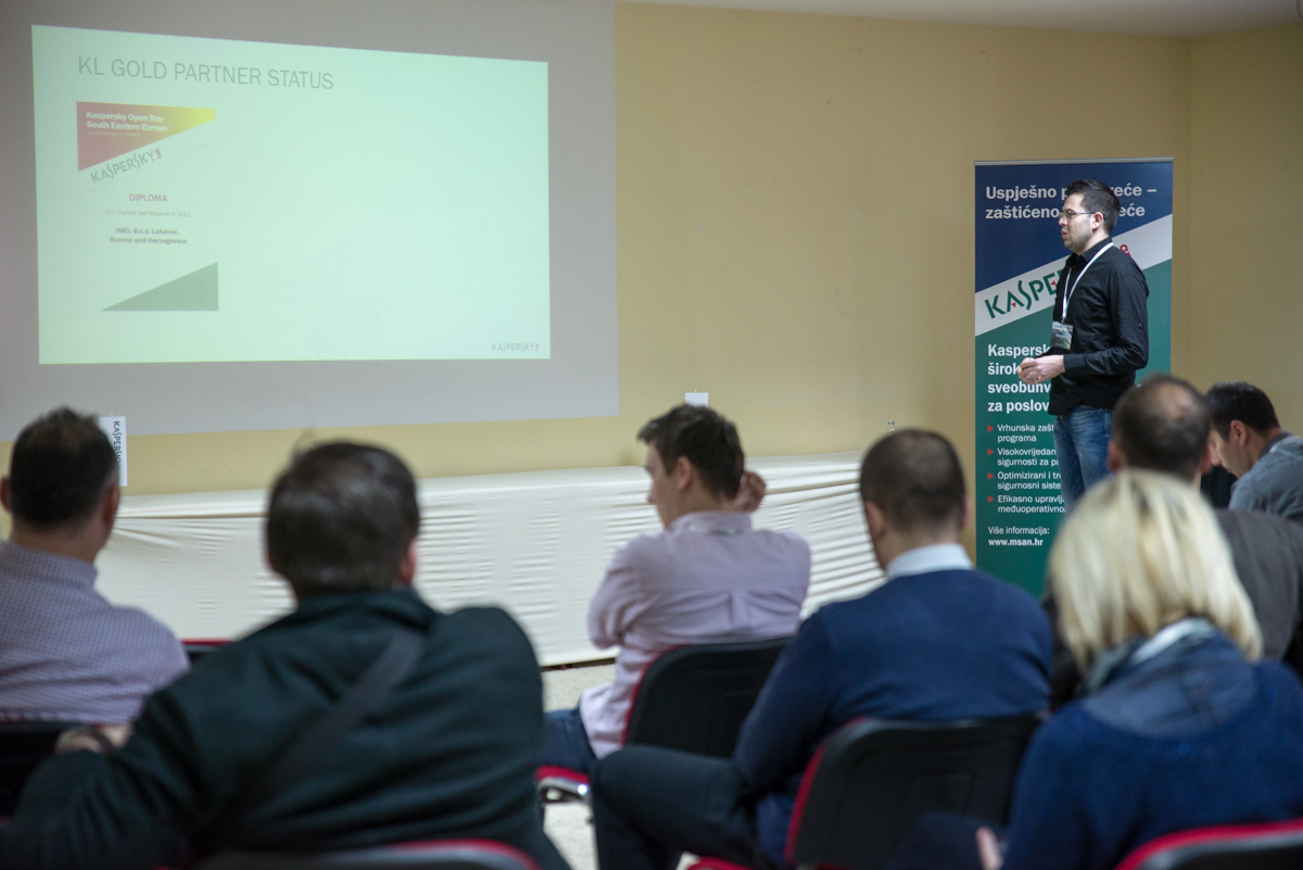 Samir Halilčević iz firme IMEL prisutnima je predstavio stranicu http://kaspersky.imel.ba na kojoj posjetioci mogu da se informišu o najnovijim rješenjima iz Kaseprsky Lab-a, zatraže pomoć ali i izvrše kupovinu željenih rješenja. U svom obraćanju se osvrnuo na najznačajnija otkrića cyber prijetnji kompanije Kaspersky Lab. Pored toga, u svom izlaganju je predstavio nagrade i priznanja ove kompanije u prošloj godini te najavio nove Kaspersky Lab proizvode za 2015. godinu.”