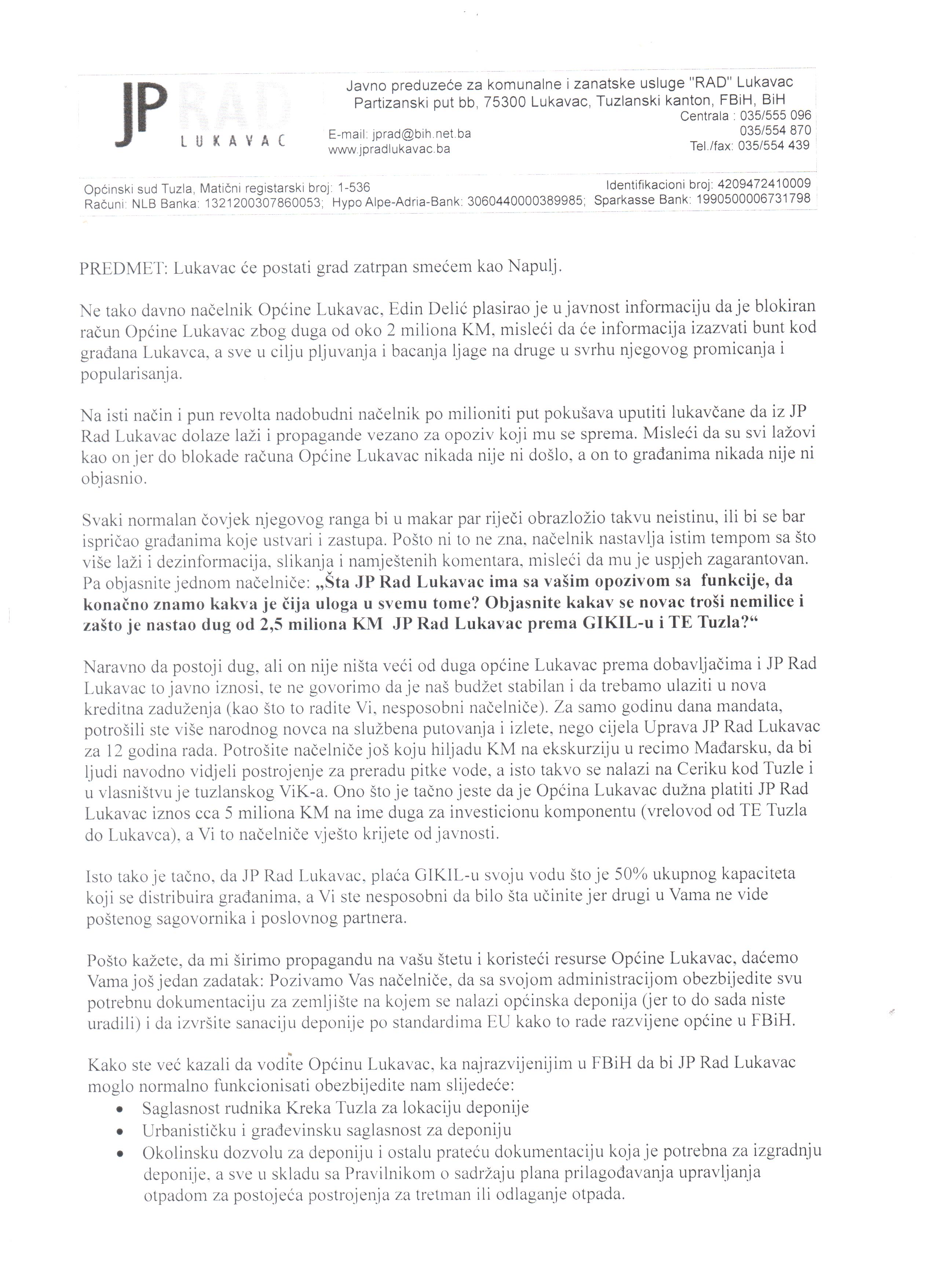 zadnju godinu dana Lukavac nema pitku vodu,grijanje deponiju za smece sto je ostavila SDA sa svoim koalicionim partnerima samo umasti.gospoda iz komunalnog treba da se bavi poslom za sto je formirana a ne da place za proslim nacelnikom i zagovara opoziv sadasnjeg.moze neko ne slagati se sa nacinom vodenja politike izabranog nacelnika ali posto komunalno zivi na budzetu opstine treba da sprovodi neutralnu politiku a ne da se svrstava na bilo koju stranu.krajnje je neozbiljno komunicirati sa nacelnikom putem saopstenja na portalima kada vas pritisnu iz SDA postenije je podnijeti ostavku na mjesto direktora nego iznositi pausalne ocjene o problemima grijanja ,vode i deponije za smece sto nije moguce rijesiti za godinu dana, st predhodna vlast nije mogla za dvadeset pet godina.JP.Rad neka svoj zahtjev uputi opstinskom vijecu gdje sjedi vecina na celu saSDA.