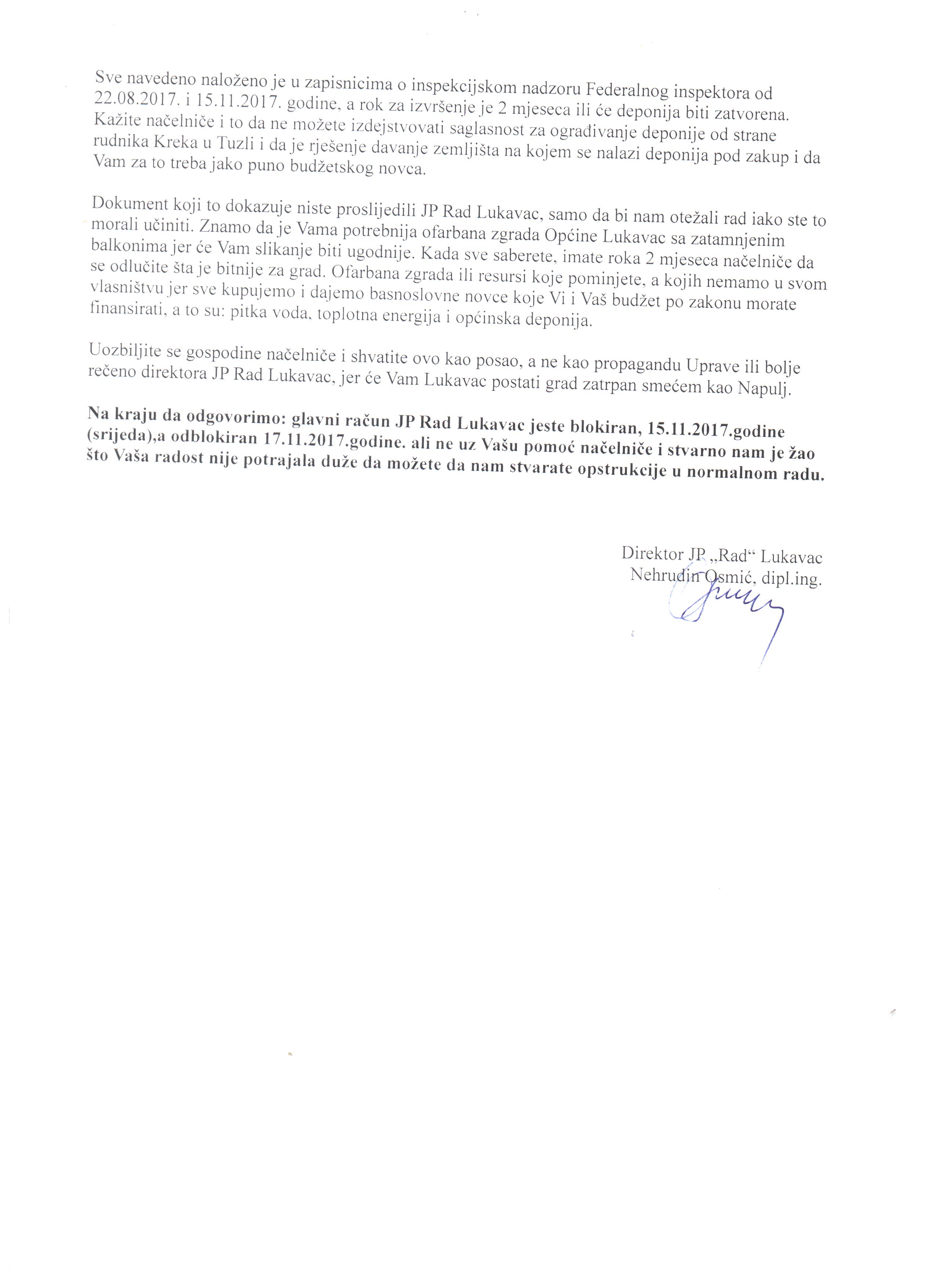 Na kraju da odgovorimo: glavni račun JP Rad Lukavac jeste blokiran, 15.11.2017.godine (srijeda),a odblokiran 17.11.2017.godine. ali ne uz Vašu pomoć načelniče i stvarno nam je žao što Vaša radost nije potrajala duže da možete da nam stvarate opstrukcije u normalnom radu.