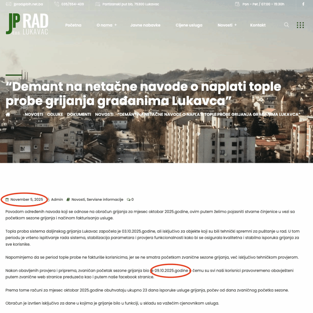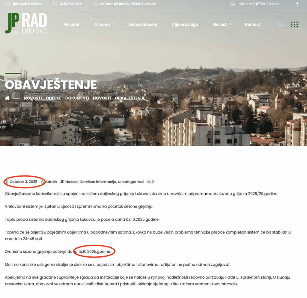Na zvaničnoj web stranici Javnog preduzeća „Rad“ d.o.o. Lukavac, dana 3. oktobra 2025. godine, objavljen je članak u kojem je jasno navedeno da „zvanično sezona grijanja počinje 15. oktobra 2025. godine“.