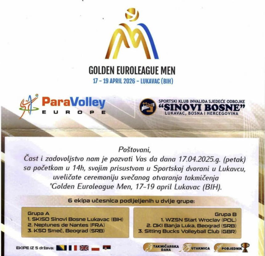 Lukavac će od 17. do 19. aprila biti domaćin prestižnog međunarodnog takmičenja “Golden Euroleague Men”, koje okuplja vrhunske odbojkaške ekipe iz regiona i Evrope. Svečana ceremonija otvaranja bit će upriličena u petak, 17. aprila, s početkom u 14 sati, u Sportskoj dvorani u Lukavcu.