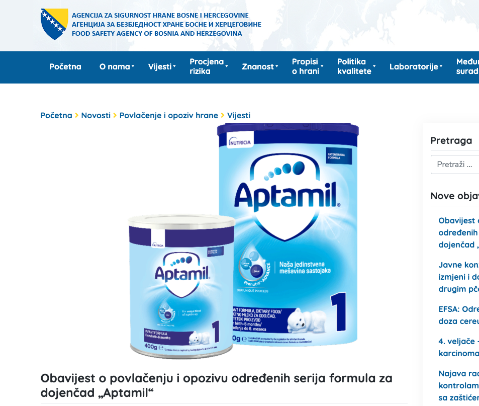 gencija za sigurnost hrane Bosne i Hercegovine obavijestila je javnost da su putem Sistema brzog uzbunjivanja za hranu i hranu za životinje Evropske unije (EU RASFF) zaprimljene informacije o distribuciji određenih serija formula za dojenčad „Aptamil“ na tržište BiH, u kojima je utvrđena prisutnost cereulida – toksina bakterije Bacillus cereus.
