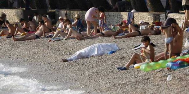No, ovaj nesretni slučaj i leš koji je na plaži bio prekriven plahtom, nije omeo prisutne kupače. Na svega nekoliko metara od leša, ljudi su se i dalje sunčali i brčkali u plićaku.