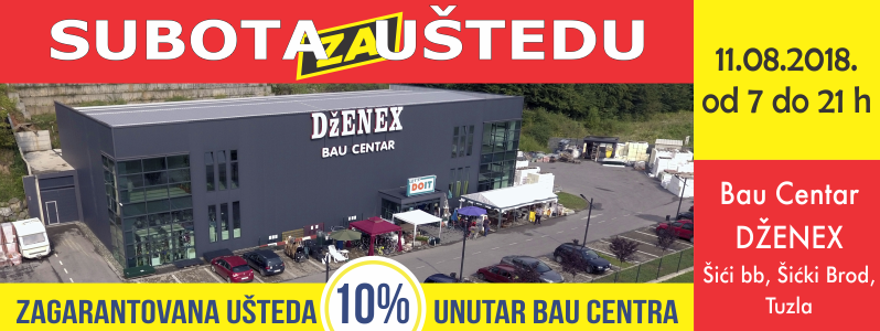 U subotu, 11.08.2018. adresa za uštedu je Bau centar Dženex na Šićkom u Tuzli. Unutar Bau centra štedite zagarantovanih 10%, a na odabrani asortiman i do 30%.