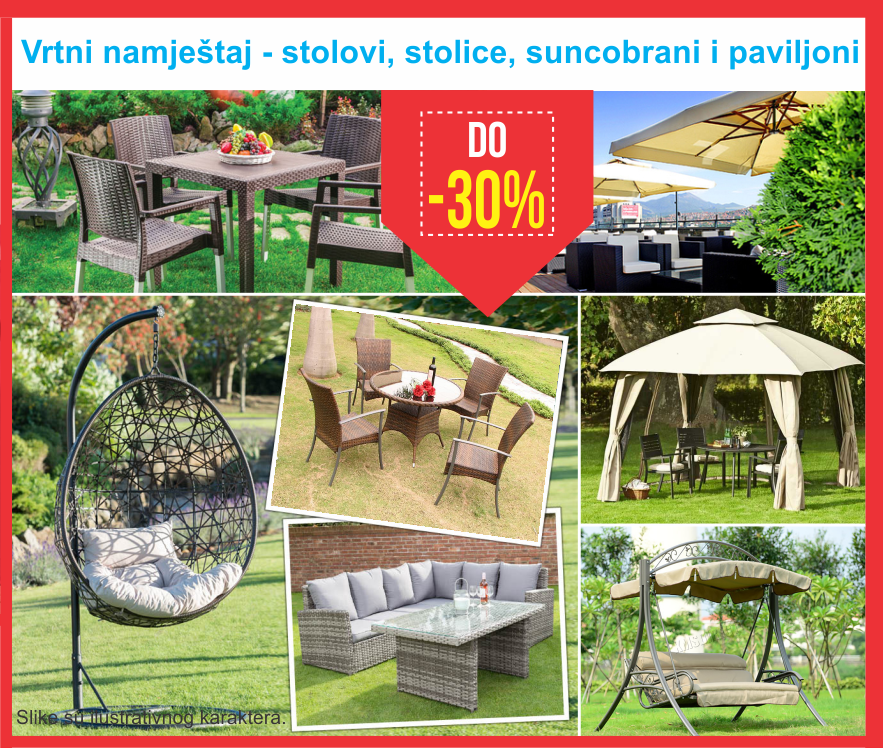U bogatoj ponudi možete pronaći vrtni namještaj, stolove i stolice, suncobrane, šatore i paviljone snižene do 30%.